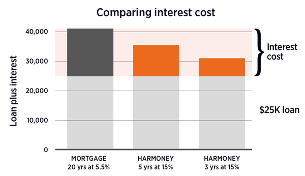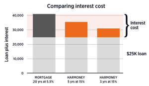 Compare that to borrowing $25,000 at 15% over three years, also with monthly repayments. You’ll pay back a total of $31,199, or $6,199 in interest.